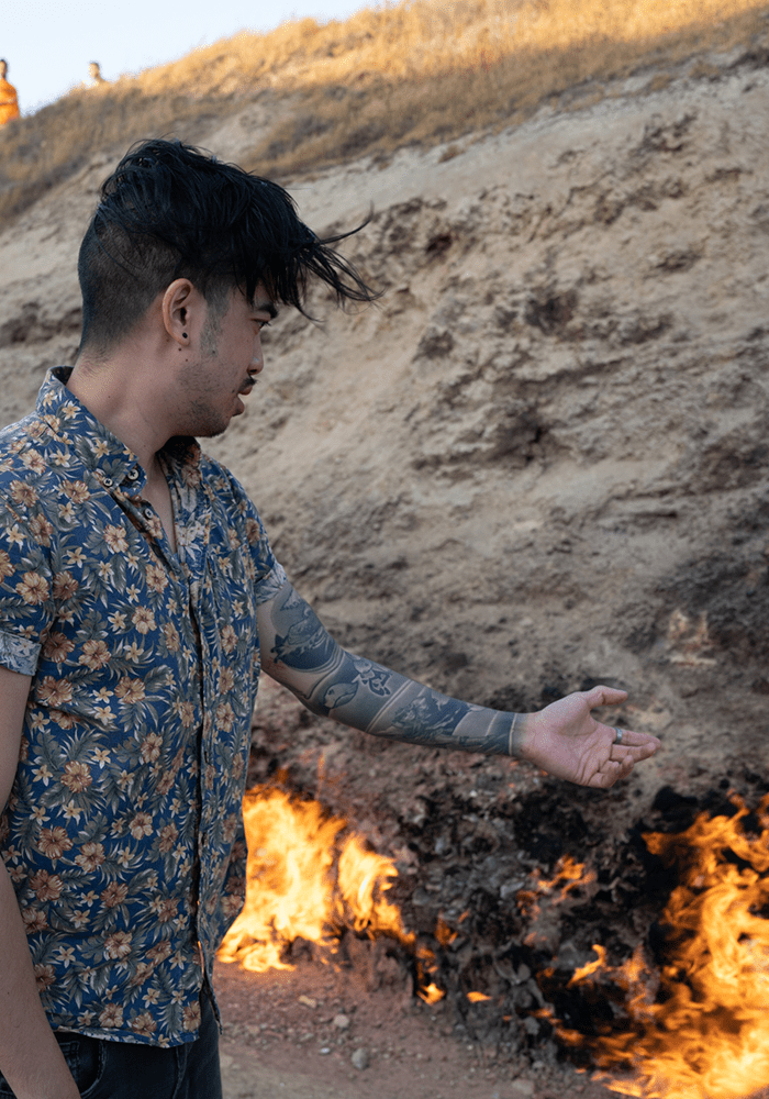 After a long day of shooting in Gobustan, we made our way to our final destination for the day—Yanardag, the “Burning Mountain.” Known as one of Azerbaijan’s most iconic landmarks, Yanardag is home to natural flames that have been burning for thousands of years, their steady glow a testament to the timeless energy of the earth. As we arrived, the flames seemed to embody the spirit of the land itself, casting a mesmerizing light over the evening and adding a sense of mystery to our journey.