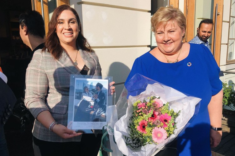I 2020, overrekker Shervin Najafpour en gave fra prosjektet “Discovering the Land of Our Origin” til den norske statsministeren Erna Solberg.