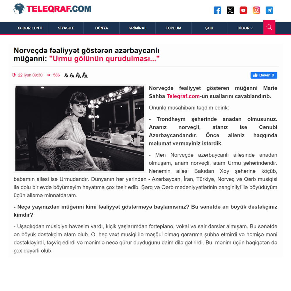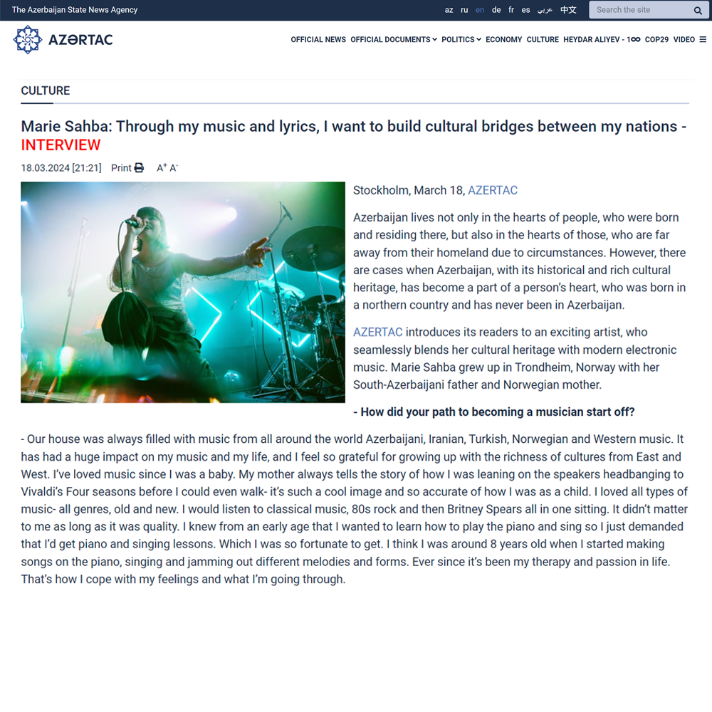 In 2019, Marie Sahba released her debut single “Take Me Back”, later in 2022, Marie Sahba released her second EP “Azeri Baby”, where she pays a tribute to her late father who passed away in 2021. With lyrics in both English & Azerbaijani, Marie Sahba pays a tribute to her Azerbaijani Turkic heritage!