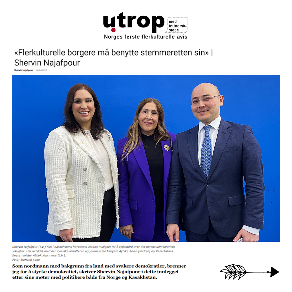 Under årets valg i Kasakhstan hadde 12 millioner stemmerett, ca. 50 % av disse benyttet seg av den. Selv i Norge møter vi utfordringer for å sikre at velgerne benytter seg av stemmeretten sin. Under hver valgkamp, tar jeg en aktiv rolle i å oppfordre de med flerkulturell bakgrunn og innvandrerbakgrunn til å benytte seg av stemmeretten sin, fordi jeg personlig mener at det er vår plikt som borgere av den norske velferdsstaten å være en del av demokratiet.
