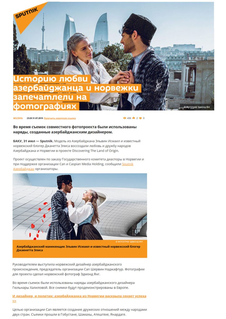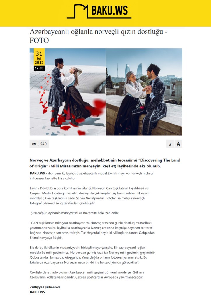 O, Norveçin tanınmış dizayner/fotoqrafı, YNG by Yang şirkətinin rəhbəri Edmond Yangla birlikdə CAN təşkilatının sədri Şervin Nəcəfpurun təşəbbüsü ilə həyata keçirilən “Milli mirasımızın mənşəyini kəşf et” (“Discovering The Land of our Origin”) layihəsi çərçivəsində Azərbaycanda səfərdə olub və çəklişlər aparıb.