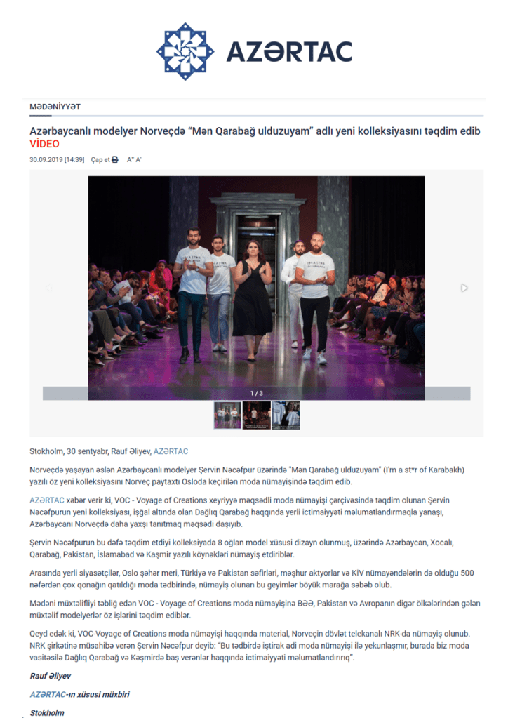 Norveçdə yaşayan əslən Azərbaycanlı modelyer Şervin Nəcəfpur üzərində “Mən Qarabağ ulduzuyam” (I’m a st*r of Karabakh) yazılı öz yeni kolleksiyasını Norveç paytaxtı Osloda keçirilən moda nümayişində təqdim edib.