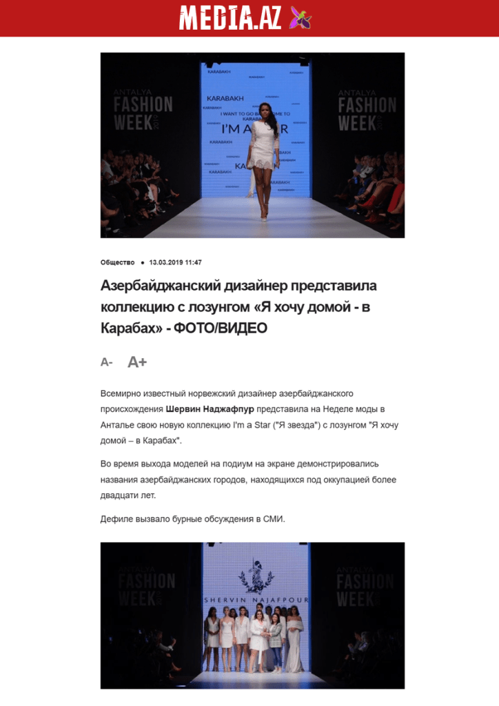 Всемирно известный норвежский дизайнер азербайджанского происхождения Шервин Наджафпур представила на Неделе моды в Анталье свою новую коллекцию I’m a Star (“Я звезда”) с лозунгом “Я хочу домой – в Карабах”.