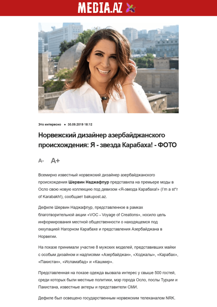 Дефиле Шервин Наджафпур, представленное в рамках благотворительной акции «VOC – Voyage of Creations», носило цель информирования местной общественности о находящемся под оккупацией Нагорном Карабахе и представления Азербайджана в Норвегии.