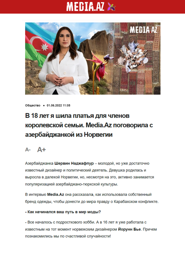 Азербайджанка Шервин Наджафпур – молодой, но уже достаточно известный дизайнер и политический деятель. Девушка родилась и выросла в далекой Норвегии, но, несмотря на это, активно занимается популяризацией азербайджано-тюркской культуры.