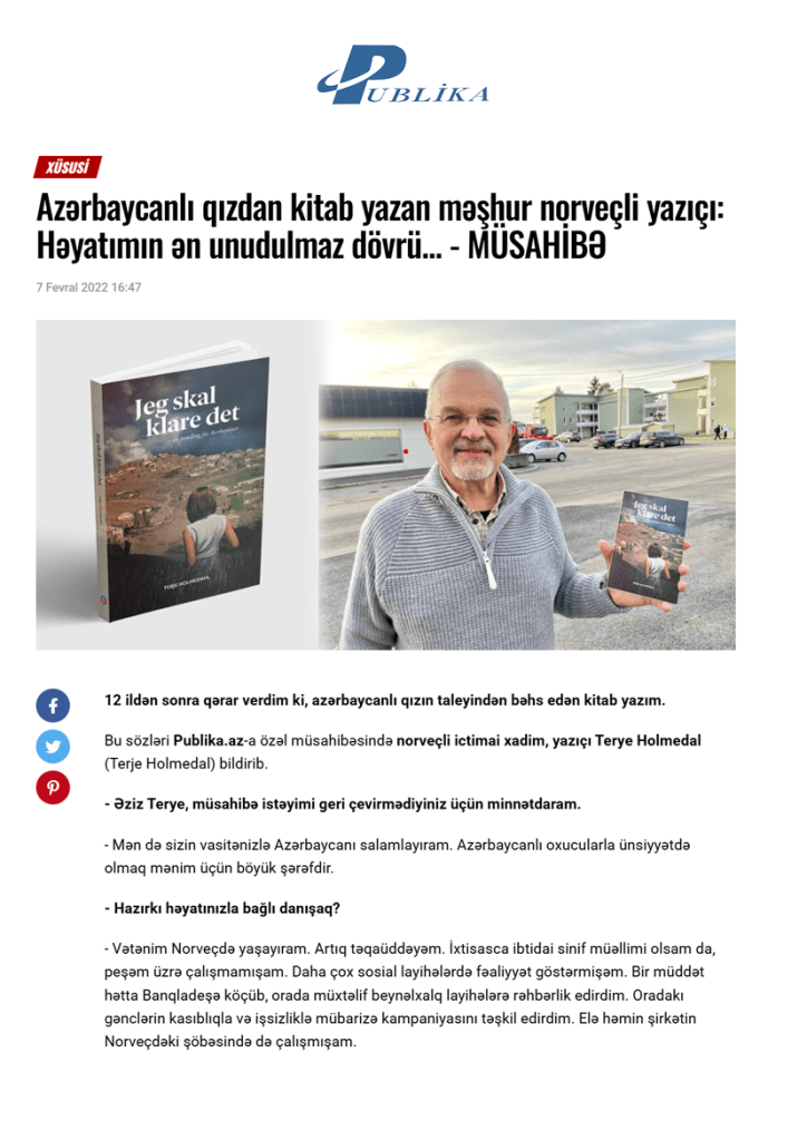 Bu günlərdə “Mən bunu bacaracağam. Azərbaycan haqda hekayə” kitabının müəllifi norveçli yazıçı Terye Holmedalla müsahibə etmişdim. Kitab Teryenin doğma övladı qədər sevdiyi, “Lalə”nin həyatından, ailəsi ilə birgə doğma torpağından məcburi köçkün düşdükdən sonra qarşılaşdığı çətinliklərdən bəhs edirdi.
