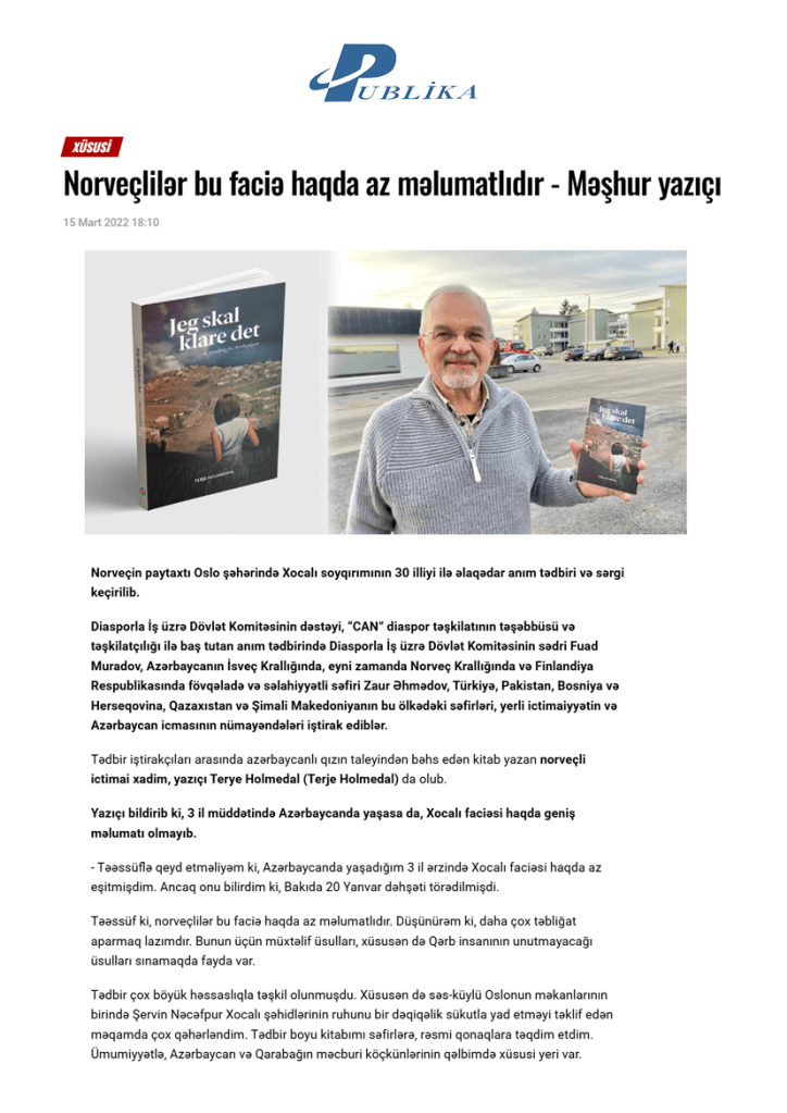 Oslo şəhərində norveçli yazıçı Terye Holmedalın (Terje Holmedahl) “Mən bunu bacaracağam. Azərbaycan haqqında hekayə” adlı kitabı nəşr olunub.