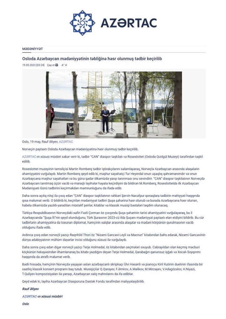 AZƏRTAC xəbər verir ki, Norveçdə fəaliyyət göstərən “CAN” diaspor təşkilatı tərəfindən həyata keçirilən bu layihə Qarabağ regionunda baş verən hadisələrin tanıdılması ilə yanaşı, xalqımızın mədəniyyəti haqqında məlumatlandırma və yerli ictimaiyyətin onunla daha yaxından tanış edilməsi üçün işlərin aparılmasını nəzərdə tutur.