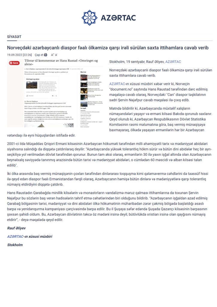 AZƏRTAC-ın xüsusi müxbiri xəbər verir ki, Norveçin “document.no” saytında Hans Raustad tərəfindən dərc edilmiş məqaləyə cavab olaraq, Norveçdəki “Can” diaspor təşkilatının sədri Şervin Nəcəfpur cavab məqaləsi ilə çıxış edib.